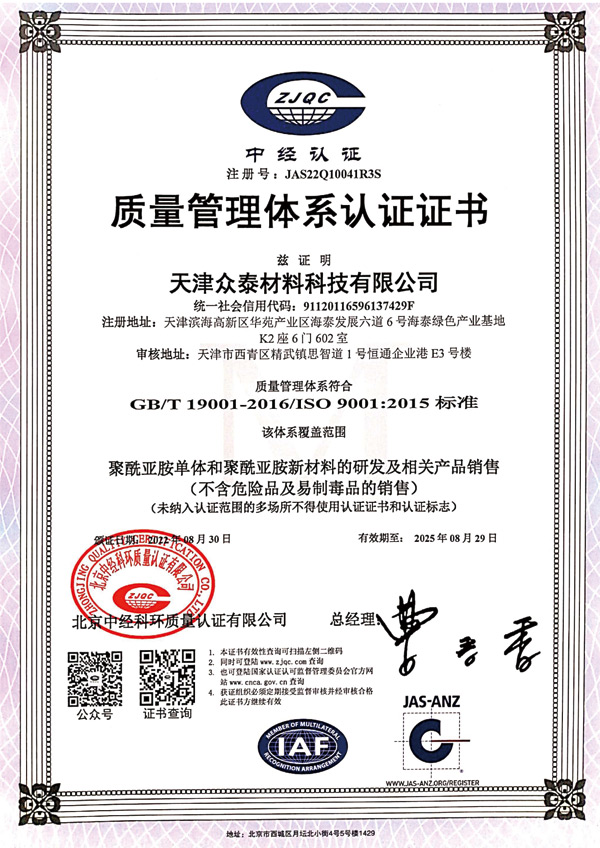 天津眾泰材料科技有限公司(以下簡(jiǎn)稱“眾泰”),是一家“以先進(jìn)功能性聚酰亞胺單體研發(fā)生產(chǎn)為核心,致力于推動(dòng)全球聚酰亞胺材料產(chǎn)業(yè)發(fā)展”為使命的創(chuàng)新型高新技術(shù)企業(yè)。眾泰研制的聚酰亞胺單體目前已廣泛應(yīng)用于無色透明柔性聚酰亞胺薄膜、柔性顯示材料、5G新材料等諸多高科技領(lǐng)域產(chǎn)品的生產(chǎn)。